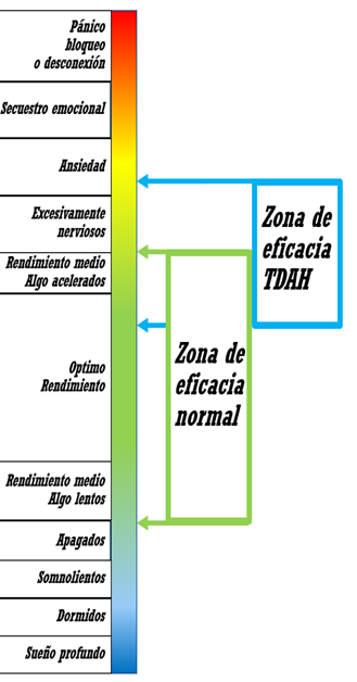 Todas estas expresiones de lo que nos hablan es de que el individuo que se encuentra en ese estado se verá incapaz de razonar, escuchar, tener autocontrol o guardar la calma. En general, todas las personas podemos recordar el haber estado infinidad de veces en ese estado y algunas, incluso, pasan casi todos los días por períodos de desregulación emocional, pudiendo llegar a normalizarlo. En el medio de la barra se encuentran los aróusales medios, la «zona de eficacia para la tarea», teniendo en cuenta que distintas tareas pueden variar levemente sus necesidades de activación. Así, para ver la tele, no necesitamos el mismo arousal que para salir a correr. Hasta aquí, es algo generalizado a todas las personas del mundo. Pero, cuando hablamos de TDAH, esto no es exactamente así.
